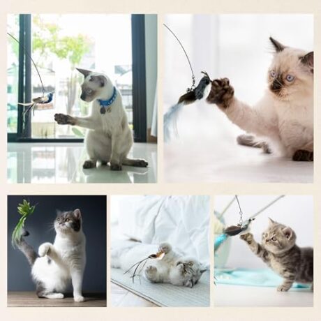 Deluxe Bird Replacement Heads for Cat Toys – Set of 5 – Realistic Feather Designs Including Blue Floral, Two-Tone, Traditional, Black & White, Green Hummingbird – Easy Clip-On