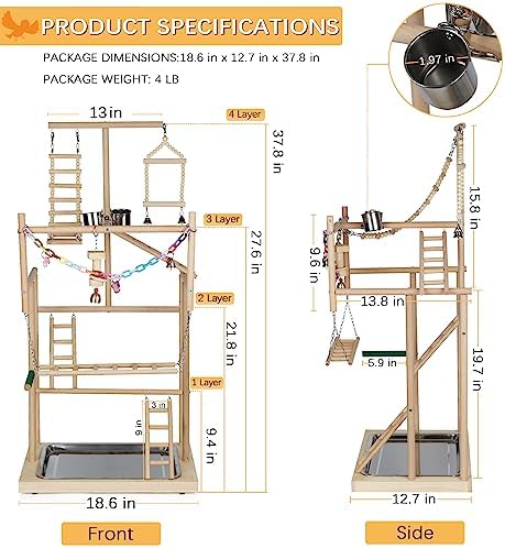 Pet Parrot Playstand Parrots Bird Playground Bird Play Stand Wood Perch Gym Playpen Ladder with Feeder Cups Bells for Cockatiel Parakeet (4 Layers)