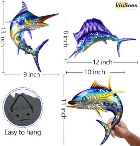 VinSees metal fish wall decor, outdoor wall art decor,bathroom beach decor,coastal ocean sea wall decor, large size metal marlin tuna wall art, tropical themed home pool beach decorations. Set of 3 ,