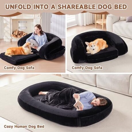 Yojoker Human Dog Bed for People Adults, 3 in 1 Giant Foldable Bean Bag Bed with Blanket, Washable Faux Fur Nap Floor Bed Adult for People, Pets Removable Large Memory Foam Human Sized Dog Bed Black