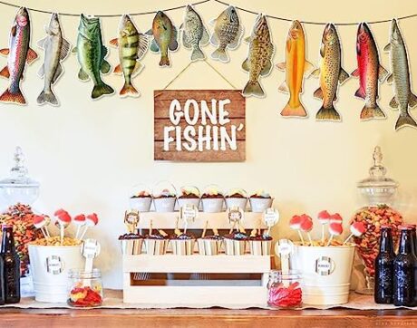 Fishing Birthday Decorations, Gone Fishing Party Supplies Sunfish Trout Bass Fishing Banner for Adults and Kids