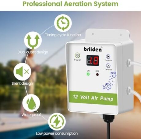 briidea New Generation, Aerator for Bait Bucket, 12 Volt Livewell Aerator Pump System with Pump Timing Cycle Function, Dual Outlet & Dual Air Pumps, Boosts Power & Extends Live Bait Freshness