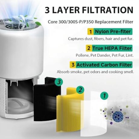 Core 300 Pet Care Replacement Filter for LEVOIT Core 300/ Core 300S/ Core 300-P/Core 300S-P/Core P350 Air Purifi-ers, 3-IN-1 HEPA Filter, Compared to Part# Core 300-RF, Yellow (2 Pack)