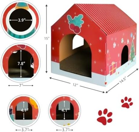 Christmas Cardboard Cat House with Scratching Pad (15″x12″x15″) Cat Play House for Indoor Cats, Christmas Decorations Scratching Pad for Kitty