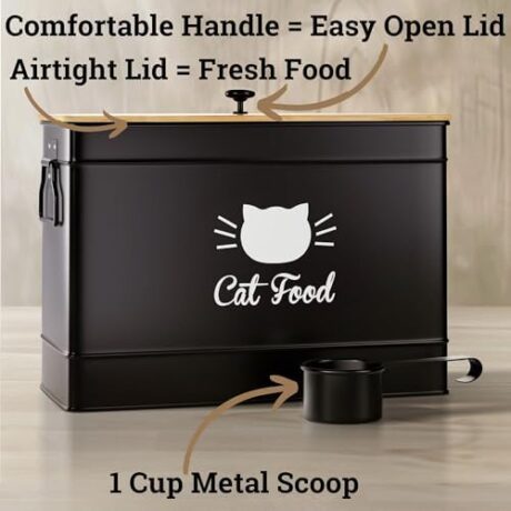 Cat Food Storage Container with Scoop – 15 lb (50 Cup) Capacity Metal Cat Food Container with Airtight Bamboo Lid & Metal Scoop – Airtight Pet Food Storage Containers – 15 lb Treats & Kibble Container