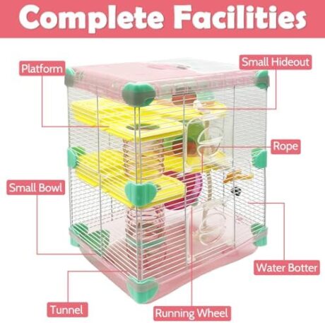PINVNBY Portable Dwarf Hamster Cage 3 Layers Dwarf Hamster Habitat Small Animal Critter Enclosure with Kettle Exercise Wheel Travel Cage for Dwarf Hamsters Gerbils (Pink)