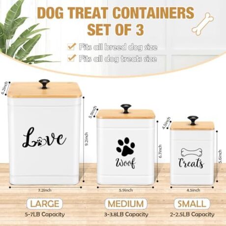 Metal Dog Treat Containers Set of 3 with Bamboo Lids and Spoon Airtight 7+3+2 lbs Dog Food Snack Jars with DIY Labels Big Pet Cookie Storage Jar for Kitchen Counter(White,Modern)