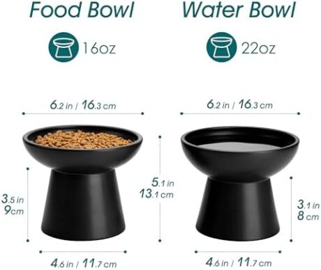 vancasso Ceramic Elevated Cat Bowls 2-Pack – 6.2″ Extra Wide Raised Cat Food & Water Dishes, 5.1″ Optimal Height Anti-Whisker Fatigue Shallow Bowls for Cats/Kittens/Dogs, Lead & Cadmium Free (Black)