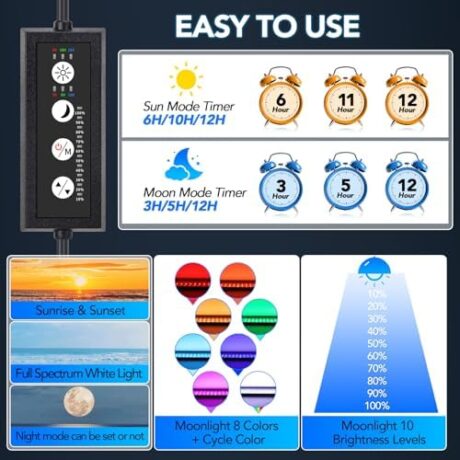 hygger Sun Moon LED Aquarium Light, Full Spectrum Fish Tank Light Day-Night Dual Timer, Adjustable 6 Timer 10 Brightness 8 Colors for Planted Freshwater Tank (20W for 18~24in Long Tank)