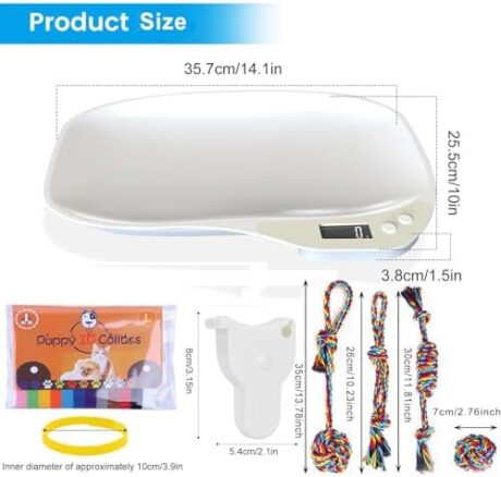 Integrated Puppy Scale,Multi-Function LCD Scale Digital Weight with 4 Dog RopeToy&15 Adjustable Puppy Collars,Perfect Puppy/Kitty/Hamster/Hedgehog,Capacity up to 33 lb,Length 11inch White