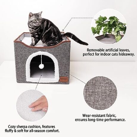 PETKARAY Cat Cave, Cat Beds for Indoor Cats, Covered Cat Hideaway Cube House with Plush Ball and Scratching Pad, Enclosed Cat Condo with Artificial Leaves