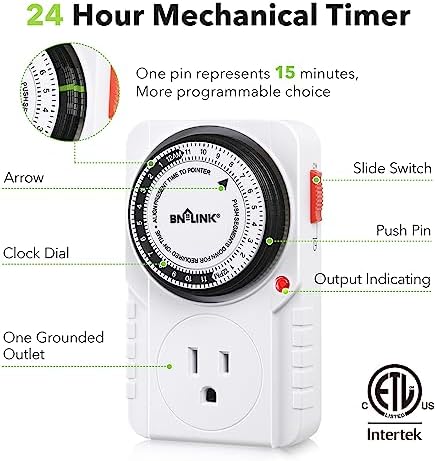 BN-LINK 24 Hour Plug-in Mechanical Timer Grounded for Aquarium, Grow Light, Hydroponics, Indoor Lighting, Home Appliances, ETL Listed 125VAC, 60 Hz, 1875W, 15A, 1/2HP (1 Pack)