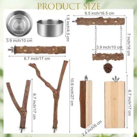 MCEAST 8 Pieces Natural Wood Bird Perches for Cage Parrot Stand Branch with 2 Bird Feeding Bowls 3.9 Inch Hanging Swing Toys Paw Grinding Fork Chewing Stick Exercise Training for Parakeets Cockatiels
