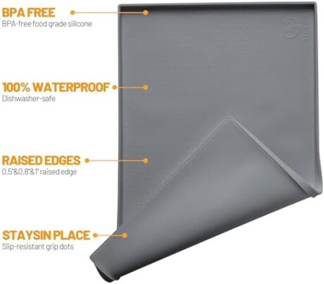 Hubulk Dog Feeding Mat,100% Waterproof Food Grade Silicone Pet Food and Water Bowl Placemat,Dishwasher, High Raised Edge to Prevent Spills,Nonslip Tray to Stop Messes on Floor (19″x12″x0.5″, Grey)