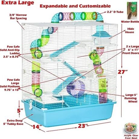 Extra Large 23″ Multi-Tiers Easy Setup Hamster Palace Gerbil Habitat Mouse House Mice Home Critters Cage Complete Set of Accessories Expandable Customizable Hide House Food Bowl Running Wheel