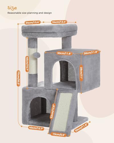 PAWZ Road Cat Tree, 30 Inches Cat Tower with Dual Condos for Indoor Cats, Plush Cat House with Padded Perch, Scratching Ramp and Posts and Replaceable Balls-Gray
