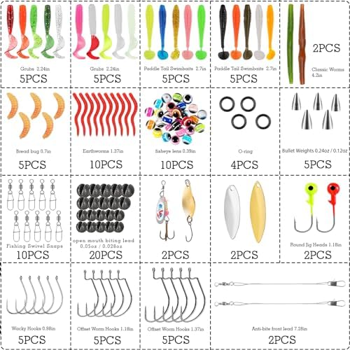 Versatile Fishing Lure Set: The Lure Set with Tackle Box contains almost every accessory including: 1 pencil, 1 minnow, 1 spinnerbait, 3 spoon baits, 37 soft baits and more. You’ll also receive 20 splits, 10 offset hooks, 5 wacky hooks, 2 jig heads, 5 weights and sinkers, and 26 other accessories. From common fishing lures to accessories, this fishing lure set is a complete set that is suitable for any angler fishing in any water in any season.