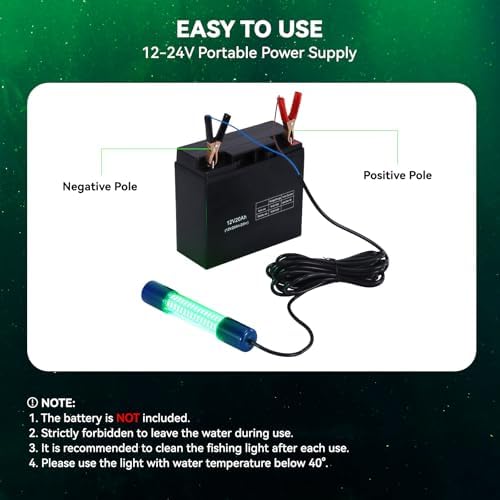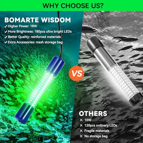 Easy Setup & Safe Operation: The Bomarte Wisdom submersible fishing light features convenient battery clips and a built-in weight to keep it fully submerged while in use. Important: Always place the light underwater before connecting to power, and never operate it above the water surface. And keep the light under the water all the time during use. After use, turn off the power first and allow the light to cool naturally in water to prevent overheating and extend its lifespan.