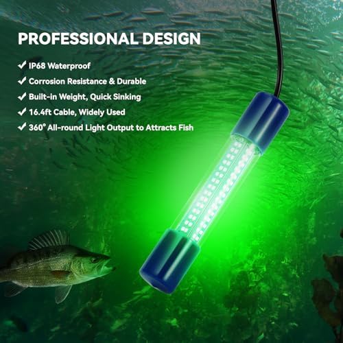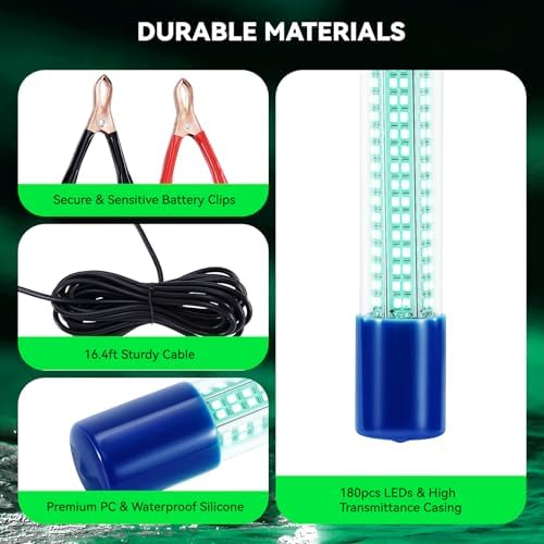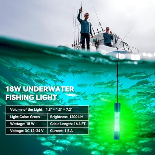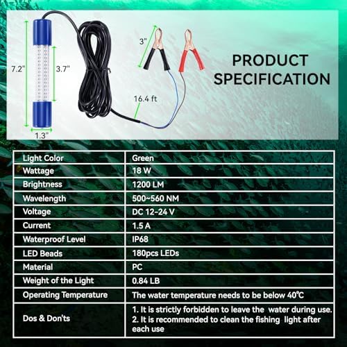 18W & 360° LIGHT OUTPUT: Equipped with 180pcs high-efficiency LED beads (0.1W per LED), this powerful 18W light delivers exceptional brightness. It operates on a DC 12-24V input and features built-in heat sinks under each LED to maintain brightness and prevent overheating. The 360-degree lighting design ensures maximum visibility, attracting marine and river fish effortlessly. With a 16.4ft (5m) power cord, the light can penetrate up to 70m underwater, making nighttime fishing more effective.