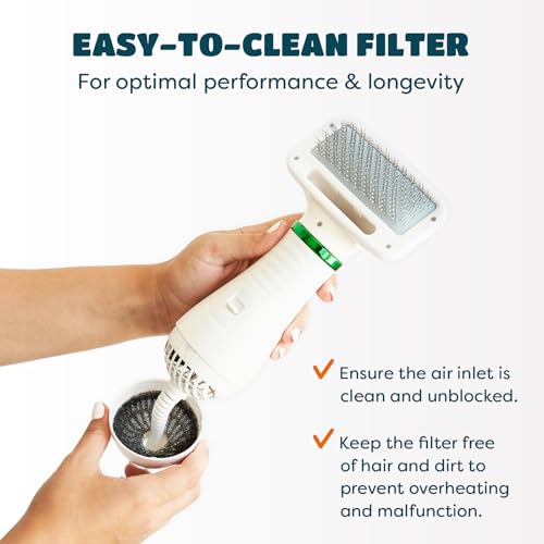 【Overheat Protection & Adjustable Temperature】 Select between low (104°F) and high (140°F) heat settings to suit your dog’s needs. Always keep the brush moving to avoid skin burns. The dryer features an overheat protection system that automatically shuts off when it gets too hot. For optimal performance and to prevent quick overheating, regularly clean the filter of hair and dirt.