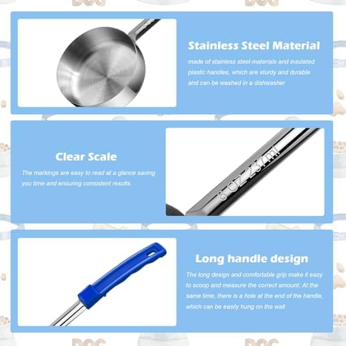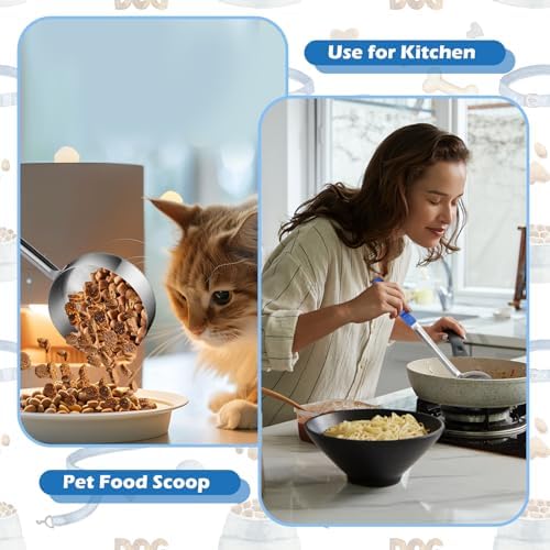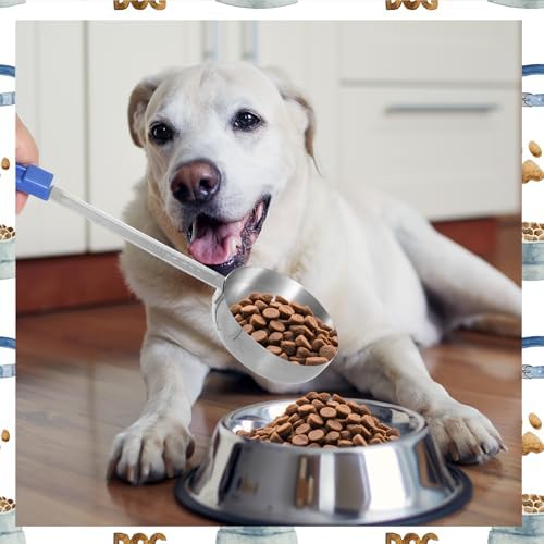 Stainless Steel Measuring Cups: The engraved measurements on the long handle scoops(237ml/8oz) provide a precise portioning guide, helping pet owners to serve the correct amount of food and maintain a balanced diet for pets
