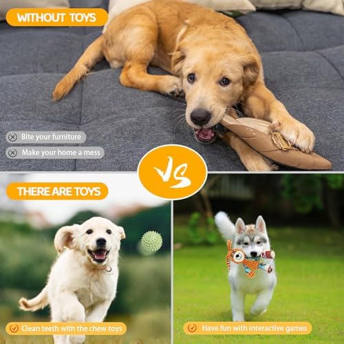 INTERACTIVE DOG TOYS FOR TRAINING & IMPROVING RELATIONSHIP: Improve your relationship with your furry friend with interactive dog toys. You can enjoy picking out and tossing a variety of rope and chew toys while educating your dog on good habits with bells and clicks. These toys also enhance your dog’s physical fitness and mental agility, and pull rope toys are perfect for playtime. Strengthen the bond between you and your dog through training and fun