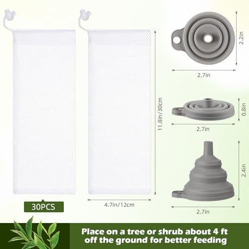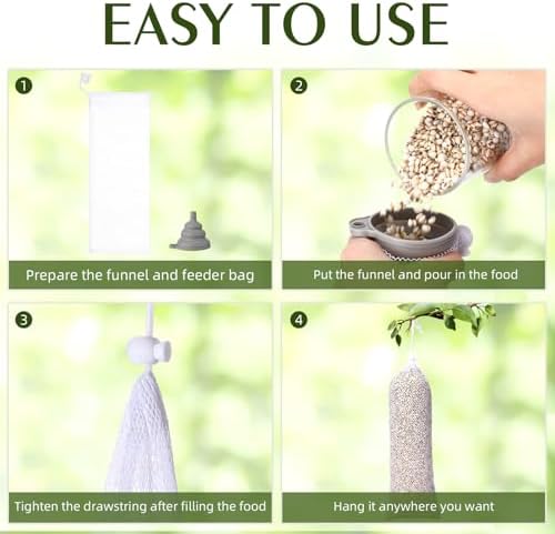 Easy to Use: first, unfold the funnel and fill the bird feeder bag with it, then tighten the drawstring at the bag’s port; Finally, hang the bag where you want to hang it; Note: please place the sock feeder on a tree or shrub about 4 feet off the ground for the good feeding effect
