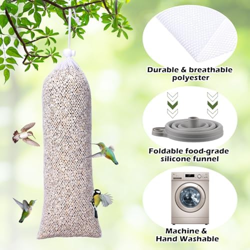 Dependable Material Quality: the finch feeders are made of strong, durable polyester material that can withstand different weather conditions; Meanwhile, the included funnel is made of safe, food-grade silicone; The ideal material combination for long-lasting and safe bird feeding equipment