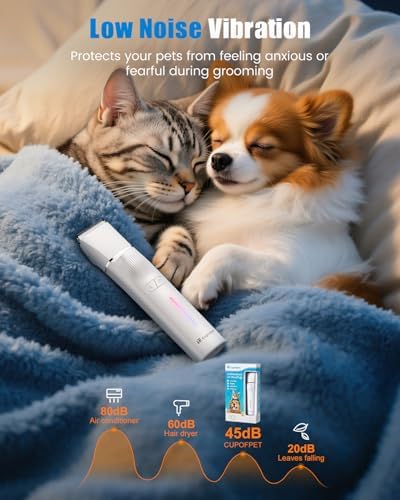 【Safety Low Noise】-The Electric Pet hair trimmer features a silent design, and operates at only 45dB, low noise protects your pets from feeling anxious or fearful during grooming. Cupofpet dog grooming clippers built-in safety mechanism to protect your pet’s skin from irritation and injuries.