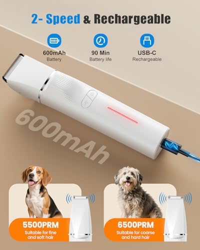 【Portable & Rechargeable】-Our cordless dog grooming clippers are very lightweight, they’re easy to carry, and it is very suitable for grooming clippers for dogs at home and outdoors.These dog hair clippers built-in a rechargeable battery, just 2 hours of charge to use it for 90 minutes continuously, no longer worry about replacing the battery and boring wire, meet multiple areas of dog trimmer for grooming, suitable for a variety of dog breeds.