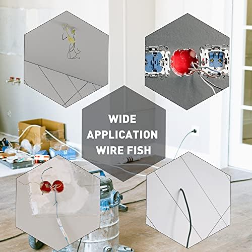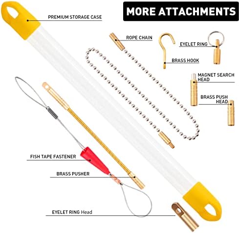 More Advantages Wire Pulling Tools: The fiberglass fish tape set is Strong flexibility and will not break when folded (But do not bend too forcibly while using!). Attached fish tape fastener can prevent casing wear and reduce wire wear, fish ball chain helps fish wires to operate the wiring through interior hollow & narrow & unclear walls with ease, flexible copper leader makes pulling or pushing flat steel tapes easier