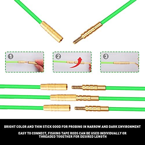 Fiberglass Rods Package Include: Made of fiberglass material, includes 15 rods (3/16″ diameter) with red fastener, brass pusher, rope chain, eyelet ring head, eyelet ring, brass hook, brass push head, magnet search head. A complete fishing wire tool for pulling wire in different situations