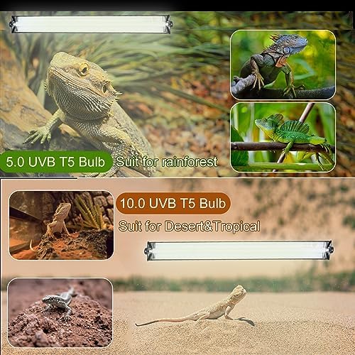 SUIT FOR RAINFOREST AND DESERT/TROPICAL – The 5.0 UVB T5 Bulb emits a lower UVB output of 5.0 perfect for reptiles that originate from rainforest environments, such as chameleons, tree frogs, and geckos. On the other hand, the 10.0 UVB T5 Bulb emits a higher UVB output of 10.0, more suitable for reptiles that come from desert or tropical environments, such as bearded dragons, iguanas, and tortoises. You can choose the UVB lamp that suits you according to your pet type.