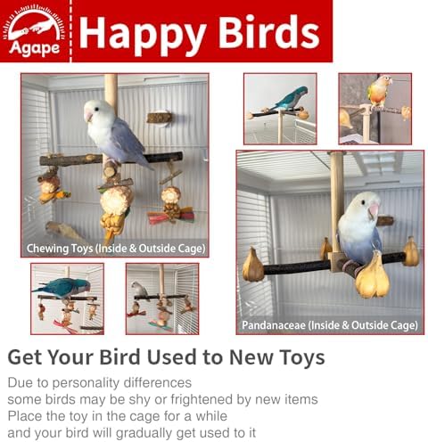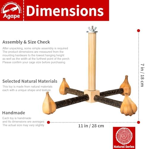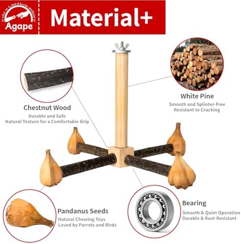 【Natural Materials】This perch is made from all-natural materials. The standing rods are crafted from chestnut wood, featuring natural grain patterns that provide a secure grip for your bird. The vertical poles are made from durable pine wood, resistant to cracking and built to last. The chew toys are made from safe, natural materials that parrots love to chew on, offering both entertainment and promoting healthy beaks