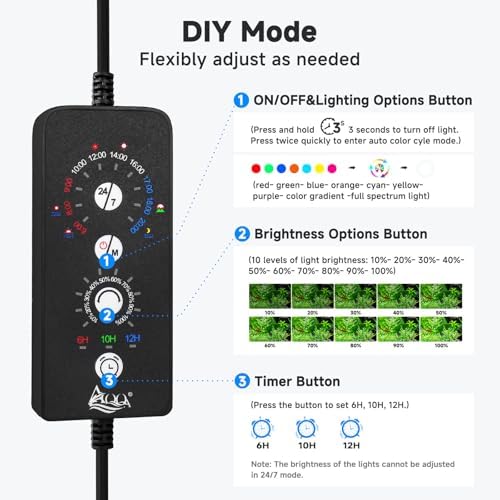 DIY MODE: You could DIY modes as you like, there have switch that ON/OFF button & change the light color or enter the color cycle & brightness & timer setting. 9 light colors available; 10 levels light brightness; 3 lighting timer setting choices 6H/10H/12H.