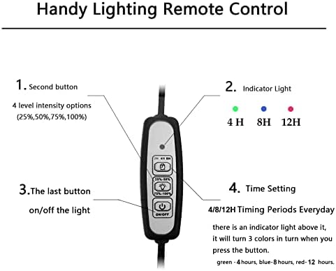 The first button is for lighting time setting: there is an indicator light above it, it will turn 3 colors in turn when you press the button. green -4 hours, blue-8 hours, red- 12 hours.