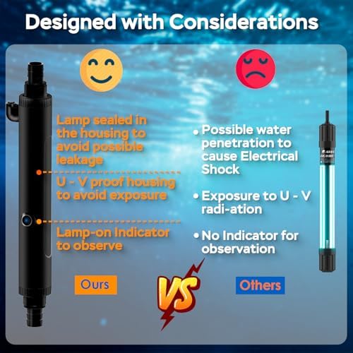 Fully Sealed & Waterproof Design – Unlike standard U-V lights, this model is fully sealed with epoxy, ensuring complete waterproofing and preventing water intrusion. It’s also versatile for both in-tank and in-line use, making it suitable for sump systems, fish tanks (should have a water pump), or canister filter setups, combining high efficiency with a sleek, unobtrusive design
