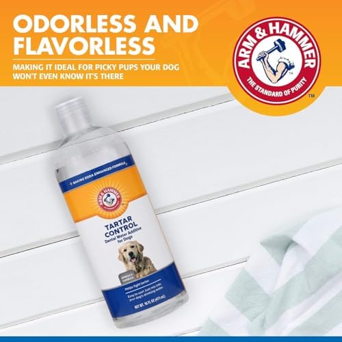 The Arm & Hammer Clinical Care Dental Dental Rinse is the easiest way to clean your dog’s teeth. Formulated with natural baking soda, this odorless and flavorless water additive for dogs helps freshen breath, eliminate tartar, and prevent tooth decay in dogs. This is an easy and effective way to prevent periodontal disease. This easy to use addition to your dog’s daily drinking water requires no brushing or rinsing. Your dog will enjoy a clean and healthy mouth by simply drinking their water. This water additive for dogs is made with the signature Arm & Hammer baking soda ingredient to deodorize bad doggie breath. This brushless solution for cleaning dog teeth includes 16 fl oz of odorless and flavorless cat water additive for an easy way to achieve fresh pet breath. Not only does this adult dog dental water additive freshen breath, but it also helps control tartar to prevent tooth decay and gum disease. DIRECTIONS – Add one capful per 8 oz of your dog’s drinking water once a day. Wash your pet’s water bowl thoroughly before refilling it and always make this a positive experience for your dog. Also look into other dog dental care products from arm and hammer. Use a dog dental care kit for dog teeth cleaning. Arm and hammer toothpaste and arm and hammer toothbrushes are important for dog dental health. Get fresh breath for dogs and puppies with this enzymatic toothpaste for dogs and dog toothbrush and dog finger brush. This dog tooth brushing kit includes a dog toothbrush and dog toothpaste for great dog dental care and dog teeth cleaning. Your dog will enjoy dog plaque and tartar remover products once they see just how important it is to keep their teeth clean. Also look into dog breath treats and dog dental spray for more help.