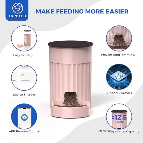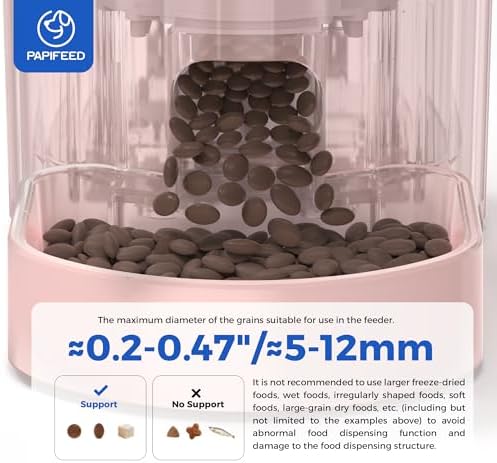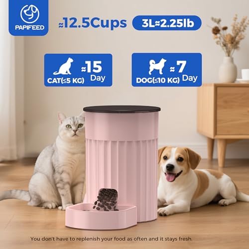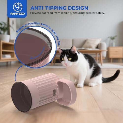 Safety lock tightening knob cover keeps food fresh and dry – PAPIFEED automatic pet feeder comes with a twist lock lid that seals the food inside the container to keep bugs and pets out, once the feeder topples over, the cover of automatic cat feeder can prevent the cat food from spilling out, and keeps cat food fresh and away from moisture while the smell of dog food doesn’t leak in your room.