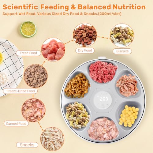 🐱【Worry-Free Timer】GAMKII Automatic Pet Feeder provides precise timed meals for your pet, including 1 instant feeding and 5 preset scheduled feedings. Customized schedule 5 meals/day for 1 day, 2 meals/day for 3 days, or 1 meal/day for up to 6 days. Memory function saves you from daily repetition.