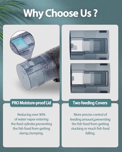 Upgraded Moisture Proof Lid: The fish food dispenser adopts the latest “moisture-proof” design, which can reduce more than 90% of water vapor entering the feed cylinder,effectively reducing moisture and clumping of fish food.Ensuring fish food keep dry and fresh status.