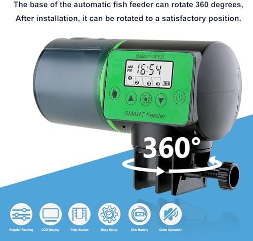 [Suitable for multiple types of food]: Capable of accommodating various forms of fish food, including pellets, trays, strips, and flakes, adapting to the dietary habits of different fish species. With a capacity of 200ml, its large size holds enough food to keep your fish fat while you’re away. Hatch style feed door is completely adjustable, allowing you to decide how much food is dispensed at each meal