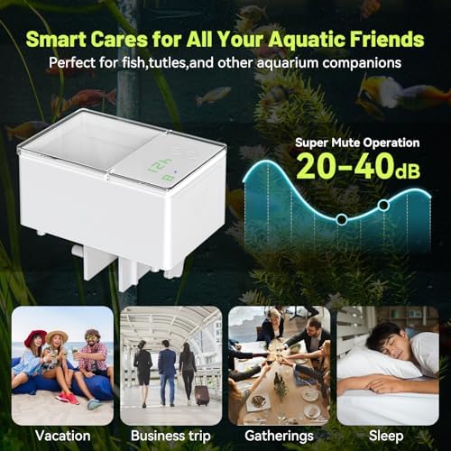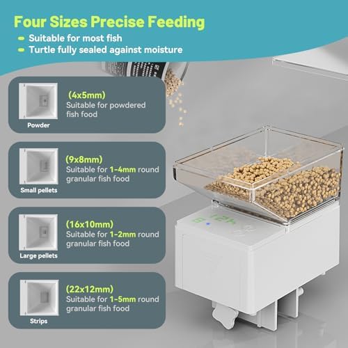 Moisture-Proof Technology: This automatic fish feeder aquarium with an upgraded moisture-proof lid to keeping fish food dry and preventing clumping,and it also prevents food from sticking to the inner wall of the food compartment and ensures the feeder feeds properly.The fish automatic feeder ensures that your fish enjoy fresh food at every meal,promoting healthier feeding,The feeder is suitable for strip, powder, pellet fish food.