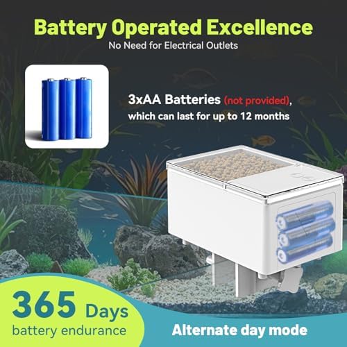 Battery-Powered(Not Included) for Portability:Powered by 3 AAA batteries (not included), this auto fish feeder for aquariums requires no power outlets,making it ideal for use in any location.3 AA batteries(not included) can last for 12 months(1 year),and long battery life ensures your fish are fed even when you’re on vacation. NOTE: Long press MANUAL button for 3 seconds to switch on/off with indicator light to confirm its status.