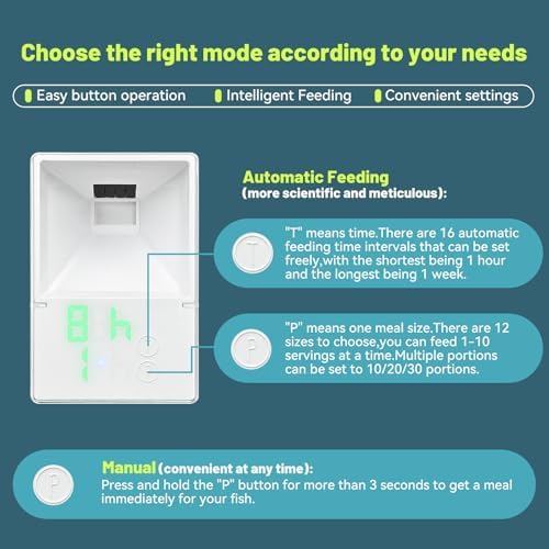 Customizable Precise Feeding Schedules: Our automatic fish feeder is smarter and provides 16 feeding interval settings,with the shortest feeding time being once an hour and the longest feeding time being once a week.And it can feed 1-10,20,30 servings and other 12 feeding amounts at a time.Additionally, you can manually feed at any time.This automatic fish food dispenser will help keep your betta from going hungry when you are busy,on holiday,or away.