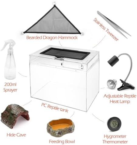 Complete 8-pack reptile kit with a durable PC tank, heat lamp, tools, and accessories—no assembly needed!