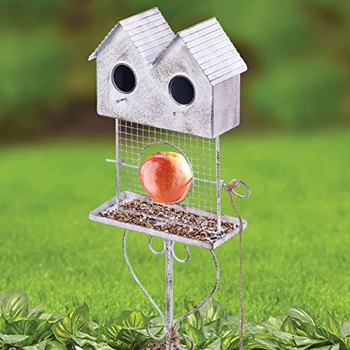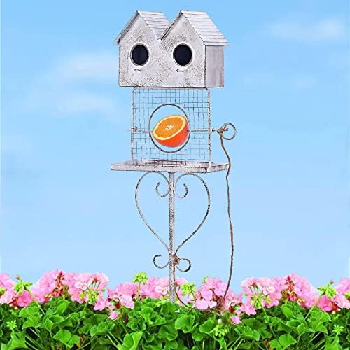 Material: The entirety of the iron stake is painted in a distressed white finish to give the stake an antique look. It is ready to withstand the rain and sun for years to come. The birdhouse is sure to make statement in your garden with this eye catching designs.