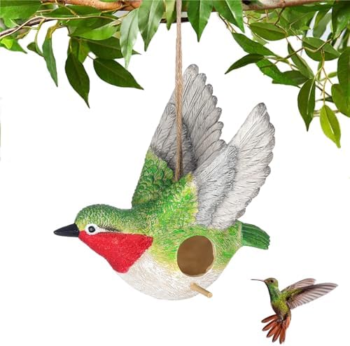 The bird house is designed into a cute hummingbird shape with hand-pained coating. It will attract different kinds of birds by this eye-catching design. This bird house will be a warm shelter when they encountered bad weather. A hemp rope at the top of bird house for hanging. Simply attach the ring rope to a desired location such as balcony, porch, ledge, bracket or tree branch. It is also a beautiful addition to dress your garden. When the birds stand on the perch, it will become a beautiful sight. The dimension of the bird house is 16.5*13*12cm. The entrance of bird house is 1.38’’. It designed for small nesting birds, such as blue birds, wrens, finches, chickadees and other nesting birds. Removable clean-out plug on the bottom makes it easy to keep your birdhouse clean. This cute bird house is made from high quality waterproof resin, a durable material for long-lasting. Resin birdhouse is lightweight, therefore, it can be hung on most hooks and brackets without fear or falling. If you are a bird lover, you will not miss this handcraft bird house. Just hang it on the tree or garden to give the birds a rest. It also can be a good gift for your friends or children who is a gardening enthusiast.