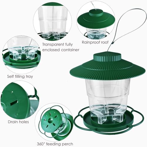 Easy to fill and clean: the roof can be rotated open for easy filling of bird food, and the bottom will automatically drop to fill the tray when the bird food is eaten.
