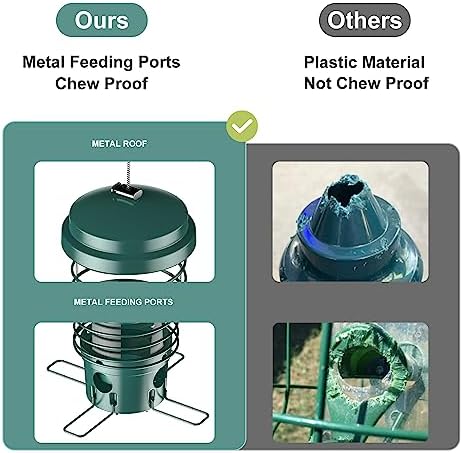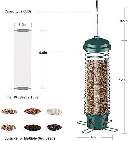 【Inner Food Tube Design & Weather Resistant】The inner food storage tube is made of thick clear plastic material, which allows you to observe the condition of the bird seed easily. And it is suitable for most of the bird seeds, like millet, black oil and striped sunflower, nyjer, cracked corn, safflower, peanut, etc. The surface of the metal is coated to prevent rust, and the roof can protect the seeds from rain and snow. And the feeding ports perches are extended for birds convenience.